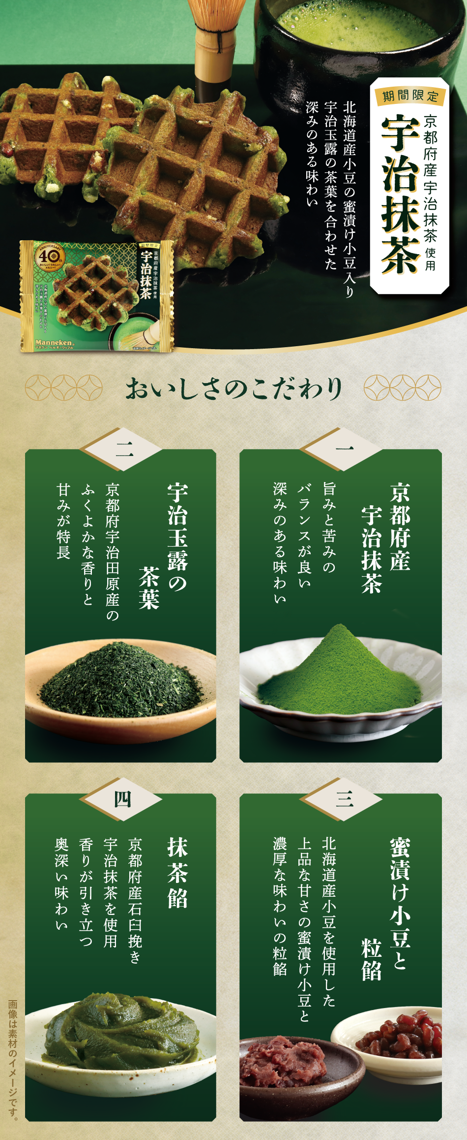 京都府産宇治抹茶と宇治玉露の茶葉を合わせ、北海道産小豆の蜜漬け小豆と粒餡、さらに香り立ちの良い抹茶餡を練り込むことで、旨みと苦みのバランスが良いお抹茶生地に焼き上げました。ほのかな苦みを感じながらも、ふくよかな甘みと香りの余韻を愉しめる春季限定のワッフルです。