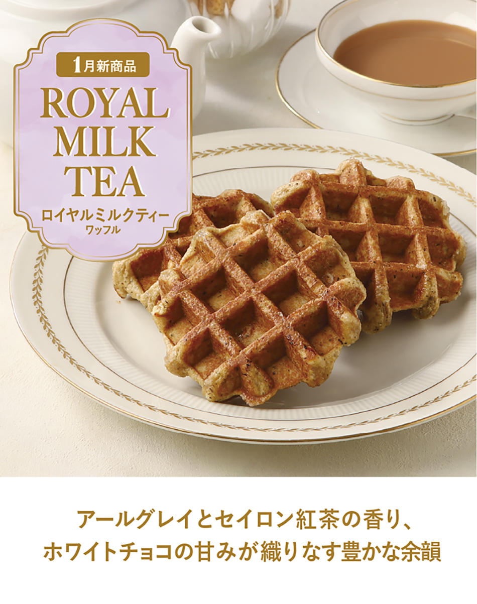華やかな香りのセイロンパウダーと、見た目にも紅茶の趣が残るアールグレイ茶葉を生地に練り込み、上品なロイヤルミルクティーの風味を丁寧に表現しました。 さらに、ホワイトチョコチップを加え、紅茶とミルクが織りなすまろやかな甘みが広がるワッフルに仕上げました。 販売期間:1/1~1月末