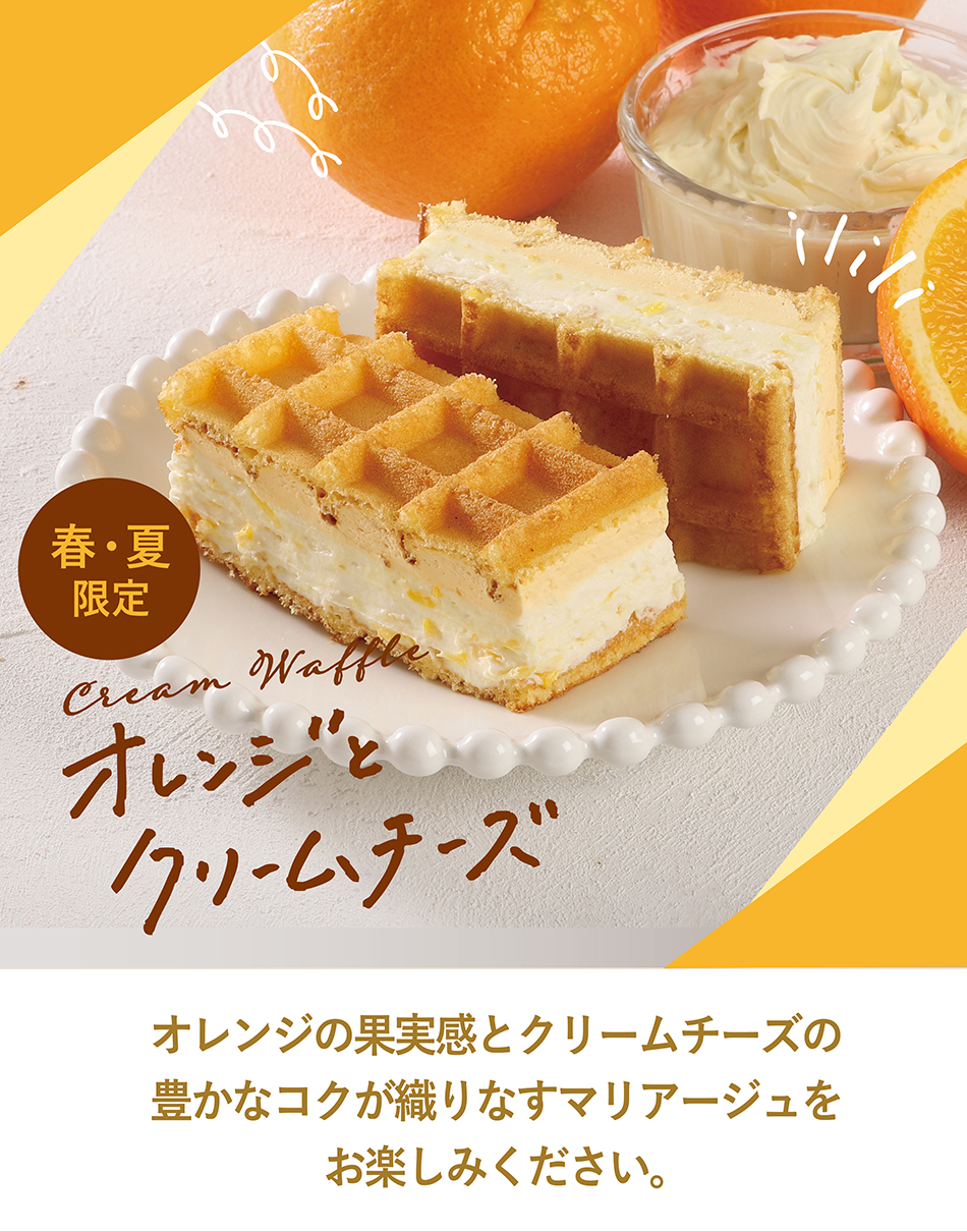 バレンシアオレンジの果肉とクリームチーズが合わさったクリームに、オレンジピール入りのクリームを重ねました。 オレンジの酸味と甘み、クリームチーズの豊かなコクとクリーミーな味わいが絶妙に合わさった爽やかな味わいのクリームワッフルに仕上げました。 販売期間:3/17~9/14