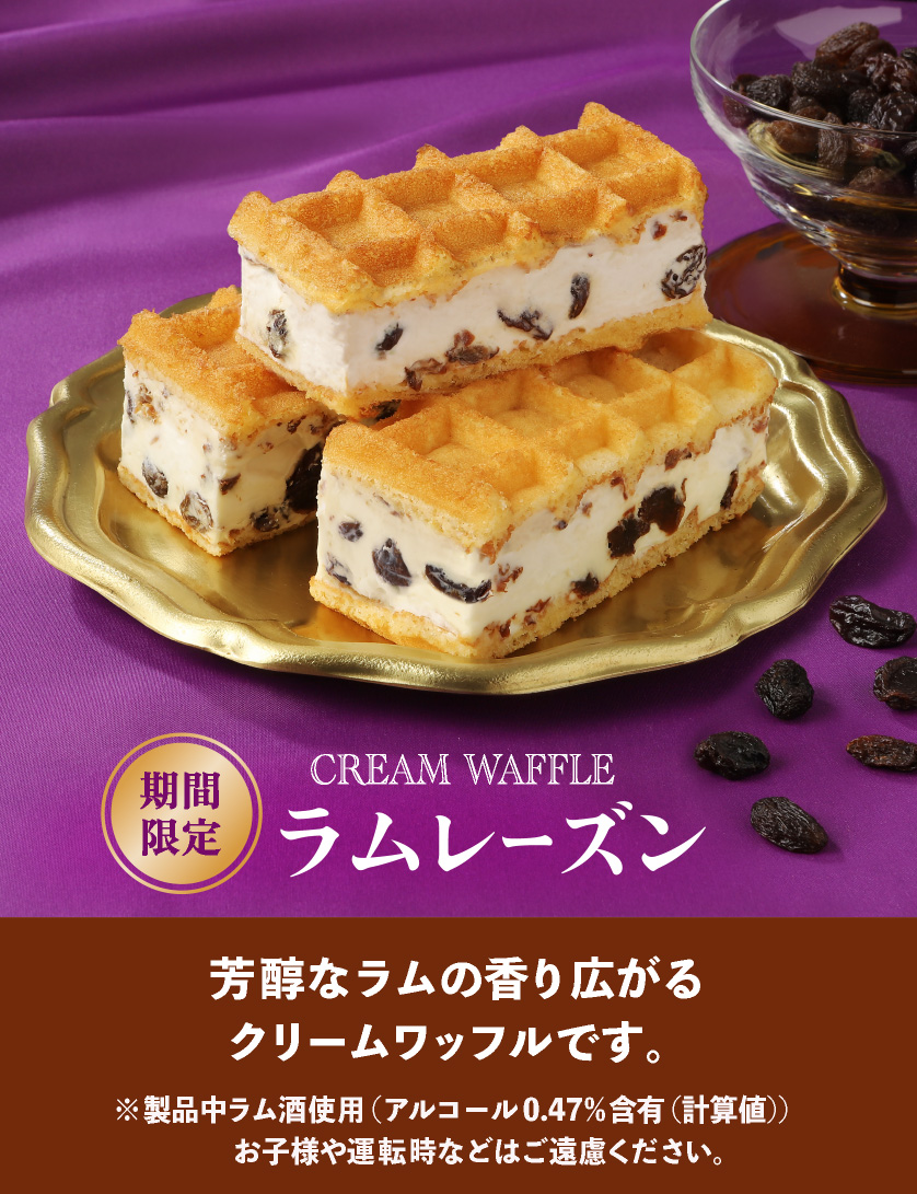 ラムレーズンの芳醇な香りと豊かな味わいが広がる、贅沢な味わいのクリームワッフルです。