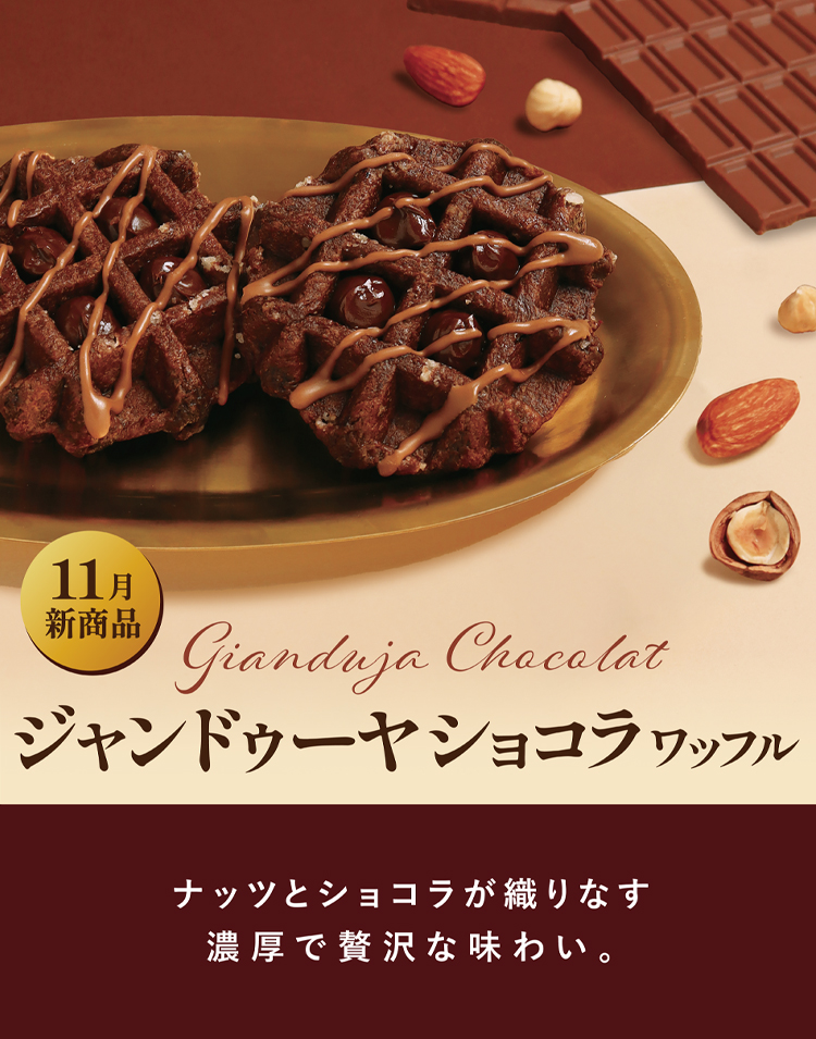 濃厚でくちどけの良いチョコレートワッフルに、ヘーゼルナッツとアーモンドが香るチョコレートスプレッドと、コクのあるキャラメルチョココーチングで華やかに仕上げました。